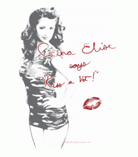 Enjoy your coffee, tea, or hot cocoa with "Pin-Ups For Vets" Founder, Gina Elise. This vintage-style image of Gina Elise in camo is printed in grey-tones. This "KISS A VET" MUG makes a great birthday or holiday gift for a Veteran!
