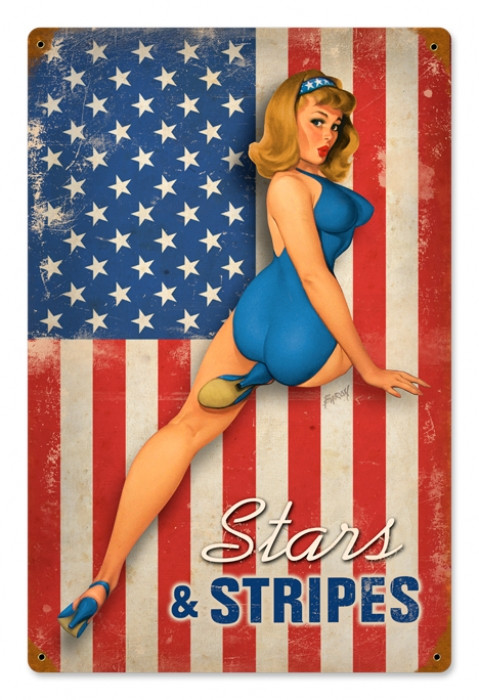 From the Baron von Lind licensed collection, this Stars and Stripes vintage metal sign measures 12 inches by 18 inches and weighs in at 2 lb(s). This vintage metal sign is hand made in the USA using heavy gauge american steel and a process known as sublimation, where the image is baked into a powder coating for a durable and long lasting finish. It then undergoes a vintaging process by hand to give it an aged look and feel. This vintage metal sign is drilled and riveted for easy hanging.